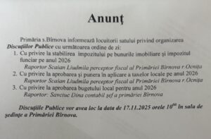 Discuţiile Publice vor avea loc la data de 17.11.2025 orele 1000 în sala de şedinţe a Primăriei Bîrnova.